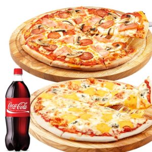 2 pizzas Senior au choix + 12 chicken wings ou 12 nuggets + maxi boisson