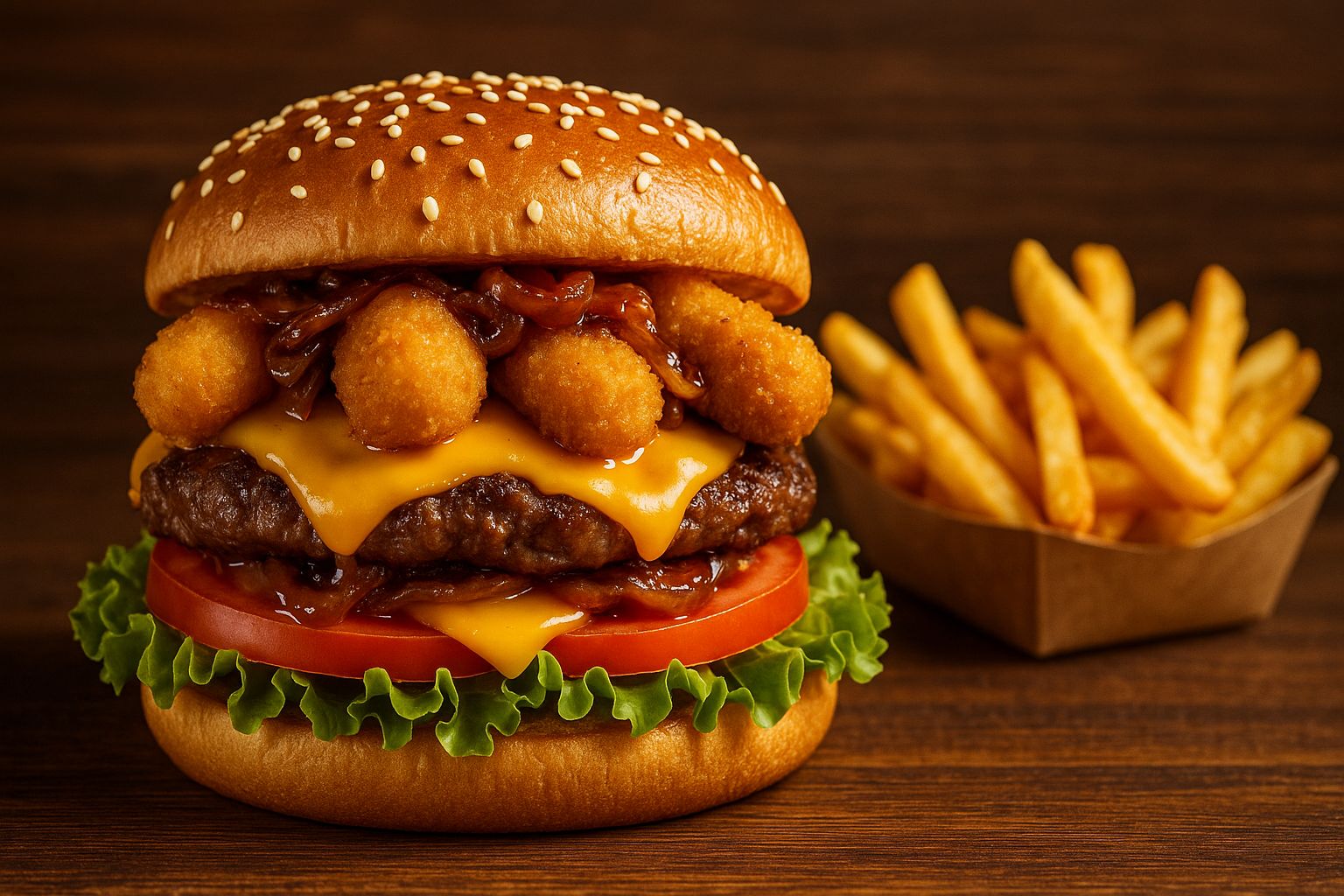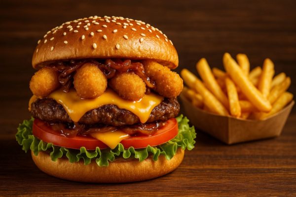 Salade, tomates, 1 steak 90 g, mozza stick, oignons grillés, cheddar