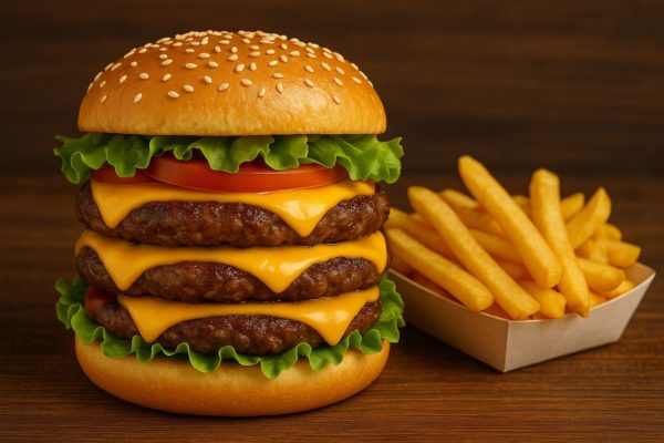 Salade, tomates, 2 steaks 90 g, 1 galette de pommes de terre, œuf, cheddar
