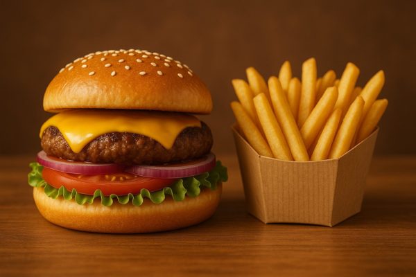 Salade, tomates, 1 steak 90 g, mozza stick, oignons grillés, cheddar