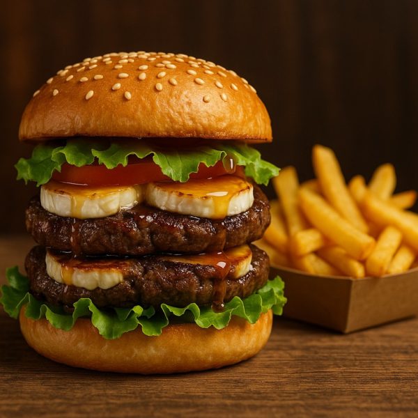 Salade, tomates, 1 steak 90 g, mozza stick, oignons grillés, cheddar