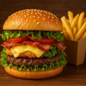 Salade, tomates, 1 steak 90 g, bacon, cheddar
