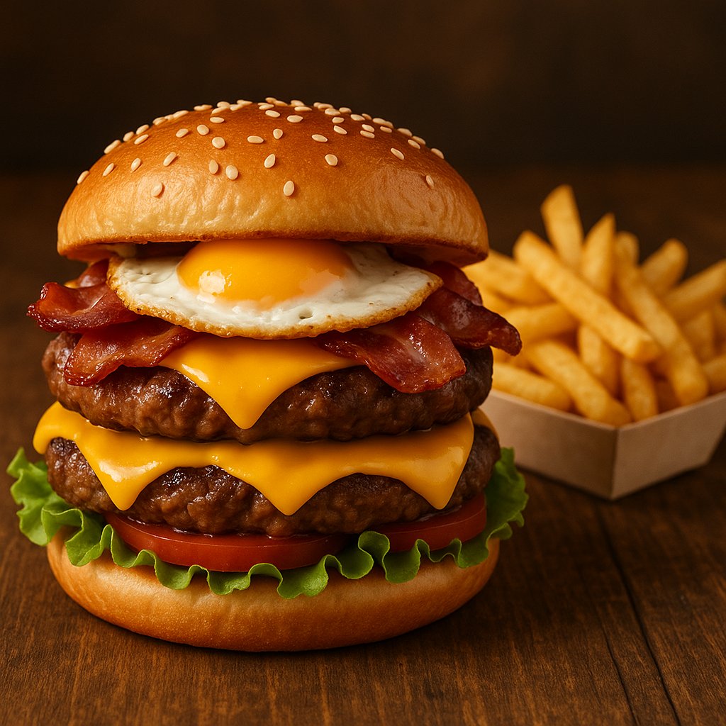Salade, tomates, 1 steak 180 g, bacon, œuf, cheddar