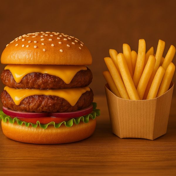 Salade, tomates, 2 steaks 90 g, 1 galette de pommes de terre, œuf, cheddar