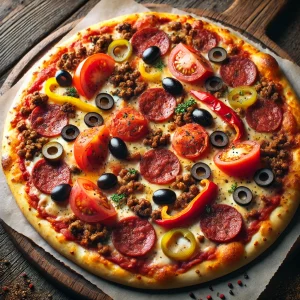 Tomate, fromage, merguez, chorizo, poivrons, tomates fraîches