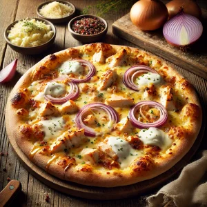 Tomate, fromage, poulet, oignons, pommes de terre, champignons