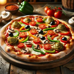 Tomate, fromage, poivrons, artichauts, olives, champignons, tomates fraîches