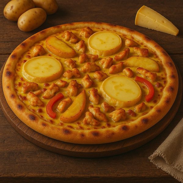 Tomate, fromage, poulet, oignons, pommes de terre, champignons