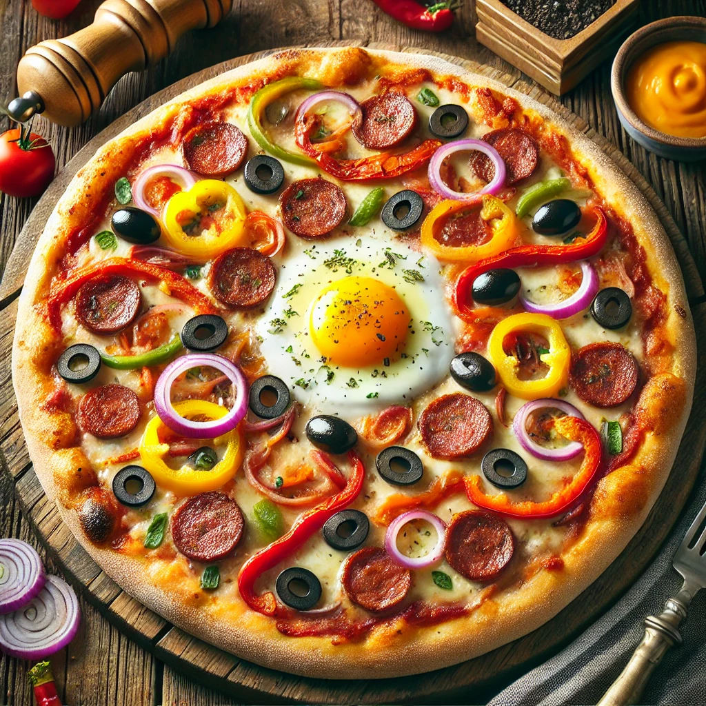 Tomate, fromage, merguez, poivrons, olives, œuf, oignons