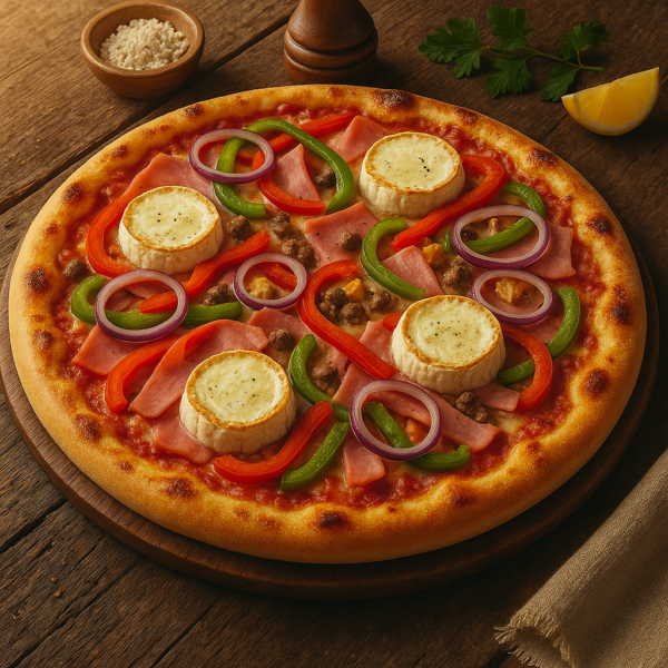 Tomate, fromage, jambon, poivrons, chèvre, oignons