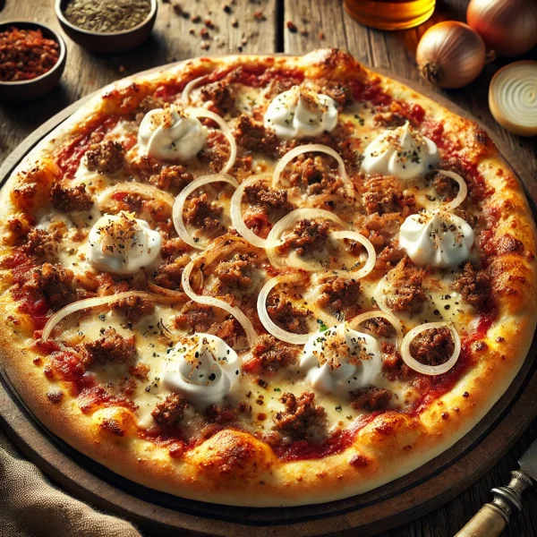 Sauce Barbecue, fromage, viande hachée, pepperoni, oignons