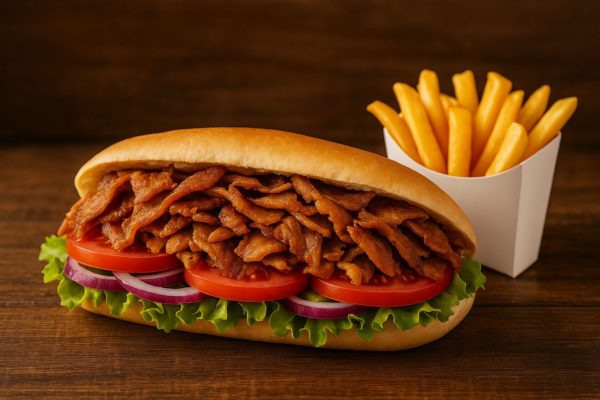 Salade, tomates, oignons, 2 steaks, œuf, bacon, cheddar