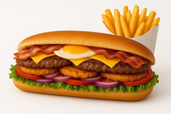 Salade, tomates, oignons, 2 steaks, œuf, bacon, cheddar